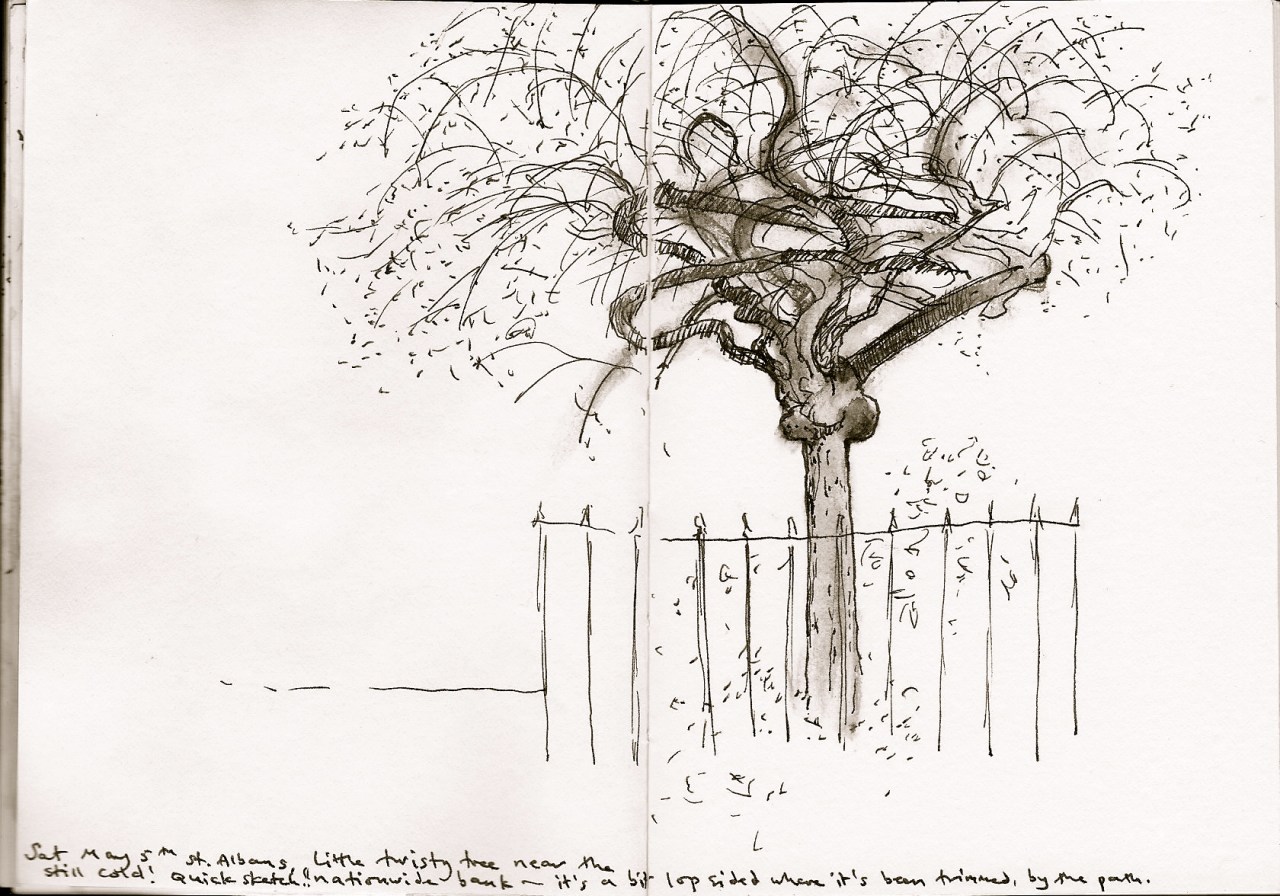 Saturday, I cycled into town. The market was busy despite the cold grey day. There was a smiling man in a tailcoat playing his violin with gusto. For a moment the sun came out and shone down on him, it was so cheerful, I stayed and watched him for a moment, and wondered about trying to draw him. Then I decided to do my errands first and sketch him later. Of course by the time I got back to the spot he had gone and the sun along with him! I know it was my fear of getting it wrong, [I don’t draw figures very often], that had stopped me having a go. I went and found a little tree that I have often admired and made a quick sketch of that instead. I feel safe with trees, they just stand there quietly! I must get braver and sketch more freely, and try and capture those fleeting moments!