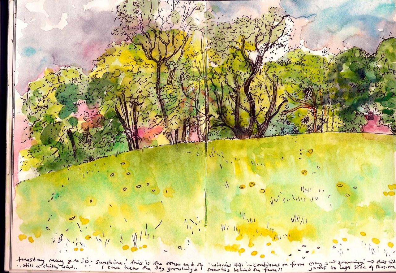 This afternoon I went out and drew the other end of ‘Winnies Hill’, it was lovely feeling the sun at last and the green grass all scattered with dandelions and daisys, so cheerful!