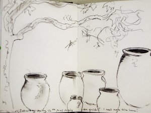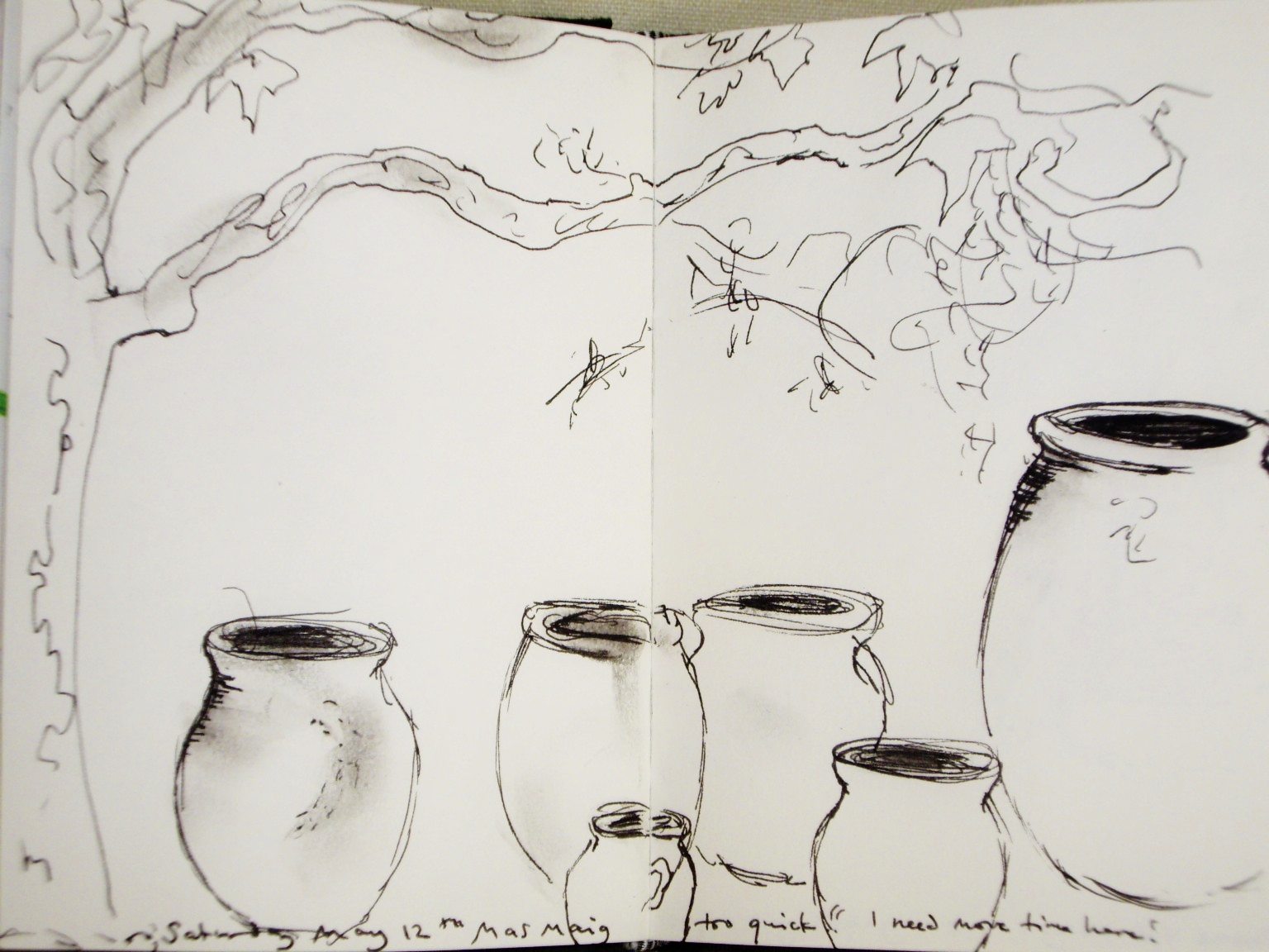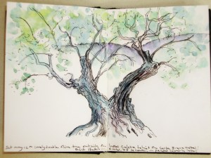 Saturday May 12th. We drive inland a little way to an old country house, passing on the way olive groves deep in long grass, wild flowers and masses of poppies, ooh, I would love to be left under a tree somewhere for a couple of hours to sketch, but this is not a painting holiday!! On the terrace of this beautiful house I try and do a quick sketch of some amazing old pots, but I only have a couple of minutes….! After lunch I try a quick sketch of an olive tree in a garden, it is missing the long grass and the wild flowers but it is better than nothing! After going to several other venues we go back to the hotel overlooking the sea.There is another hotel behind it with a double olive tree in front of the entrance, whilst Zoey and her mother in law to be, go and find room prices in Catalan, I decide to sit on the front step and do a quick sketch of the tree. Joan has the engine running and it is becoming the joke as he says, ‘go on Gerry you have a couple of minutes!’ I added a bit of watercolor later which is never as good as when it is done on the spot! It feels a bit like cheating to me!