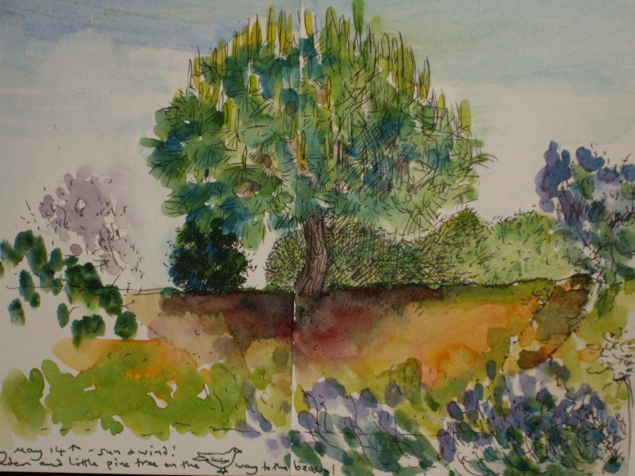 Monday May 14th. We are back in Barcelona and I try to get this blog up to date, but after writing it all out and putting in the pictures I manage to loose the lot. So I gave up for a while and Zoey and I go back down to Bogatell beach, it is very windy and we are soon sandblasted. I attempt to sketch a couple sitting under a big umbrella, but the guy can see me looking so I stop and go and find a tree instead!! Always a reliable option! they never mind you drawing them! I found one of the lovely little dumpy pine trees in the park not far from the beach, with masses of lavender, so I settle for that. I am sitting on an ants nest I later discover, but at least I did a little painting!