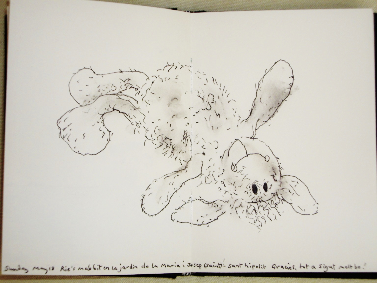 Sunday May 13th. Zoey and I have half an hour on the beach, Woo hoo! and we go in for a very quick dip as even though the sun is shining the water is very cold! I manage a quick sketch, using sea water to paint with – the sea paints itself! Then we are off again, inland through the mountains for a big family dinner! After an amazing catalan meal, I venture out into the garden with my sketchbook looking for a subject. Funny, it wasn’t the mountains in the distance or the flowers that touched me, but a little soggy dog chewed toy rabbit lying on the grass. The dog came out and wanted the rabbit as soon as I picked it up and it soon became a game, with the dog winning! but I did have the rabbit just long enough to make a very quick sketch, the dog doesn’t know it but he has helped improve my drawing speed!! Maybe I could be a quick sketcher after all!