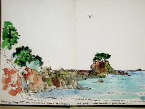 Friday afternoon we drive away from Barcelona and up to the Costa Brava to start our tour of possible wedding venues for Zoey. The second hotel we look at is gorgeous, up on the rocks overlooking the sea. There is a dance lesson taking place, and couples are moving around the room to a slow tango, so romantic! I am entranced by the twisty pine trees growing out of the rocks at the top of the steps down to a little beach, I would love to stay and draw but we have business to attend to!