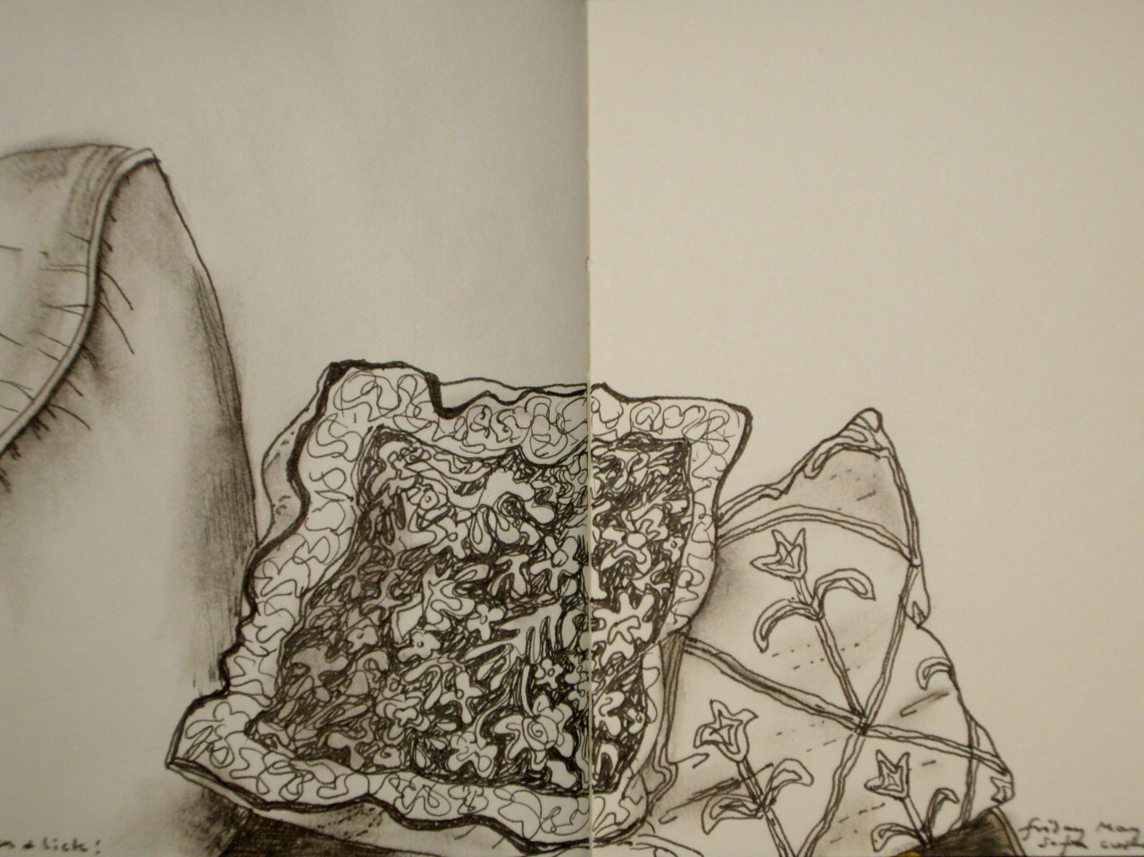 But the result of my own effort to make a sketch today is similar to my, ‘I’m too tired’ drawing from yesterday, I am sitting on the couch, only this is even worse as I am drawing the couch itself ! Still,it is better than nothing and I am promising myself to go out and do a little painting of the yellow field down the road tomorrow!
