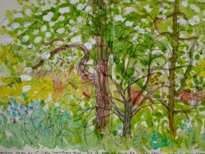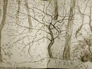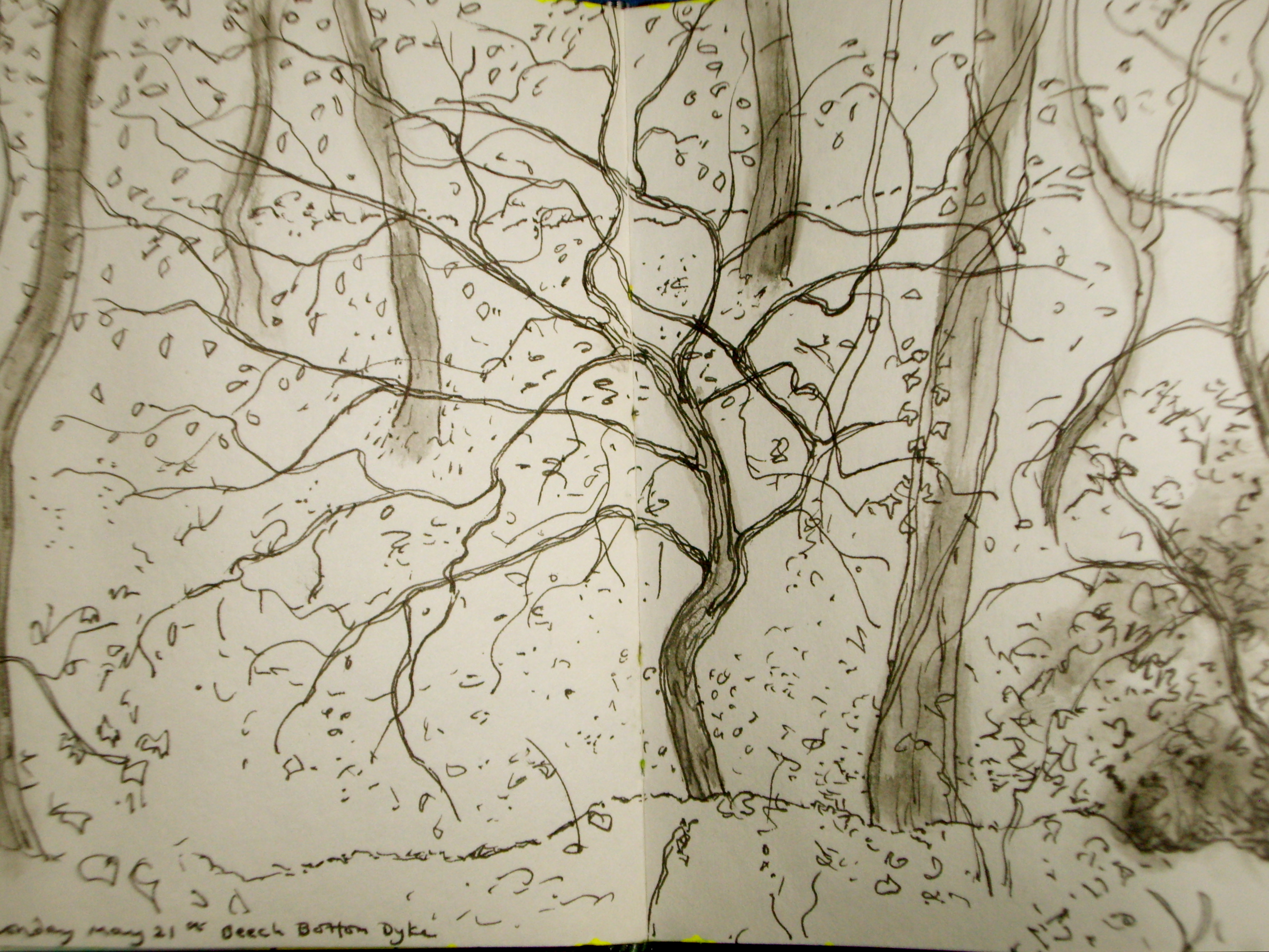 I had my sketchbook on me, as I am trying to get back into the habit of carrying it around with me, and remembered that just down the road is Beech Bottom Dyke. Amazing how you can just step off the road into an enchanted forest. I just walk a few steps up the path and sit down on the ground. I can still hear the traffic a few feet away but the birds singing out their territorial songs and the power of the trees in this wonderful place soon make me forget.