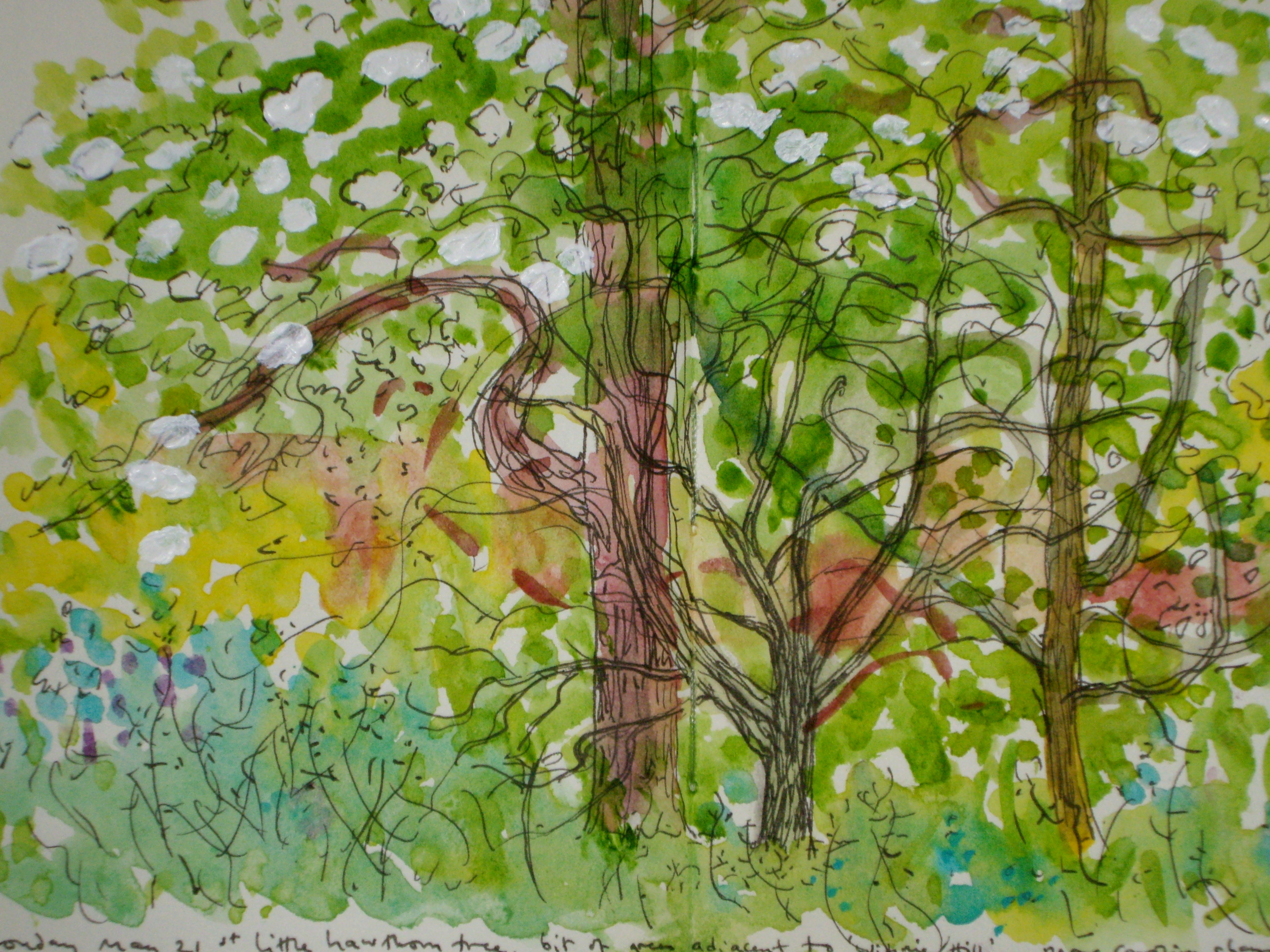 Later on in the day, around 5.30pm the sun comes out a little so I walk across ‘Winnie’s Hill’ thinking I might go into the ‘Scrap Woods’, but I am taken by a small group of trees right by the road. The white hawthorn blossom is out and still a few bluebells and a little cloud of forget me knots. They are growing in amongst a mass of that sticky plant I don’t know the name of. For the second time today I find myself sitting very near the road with cars rumbling past, but somehow captivated by how lovely a little corner can be. Nothing spectacular, but beautiful in it’s own right.