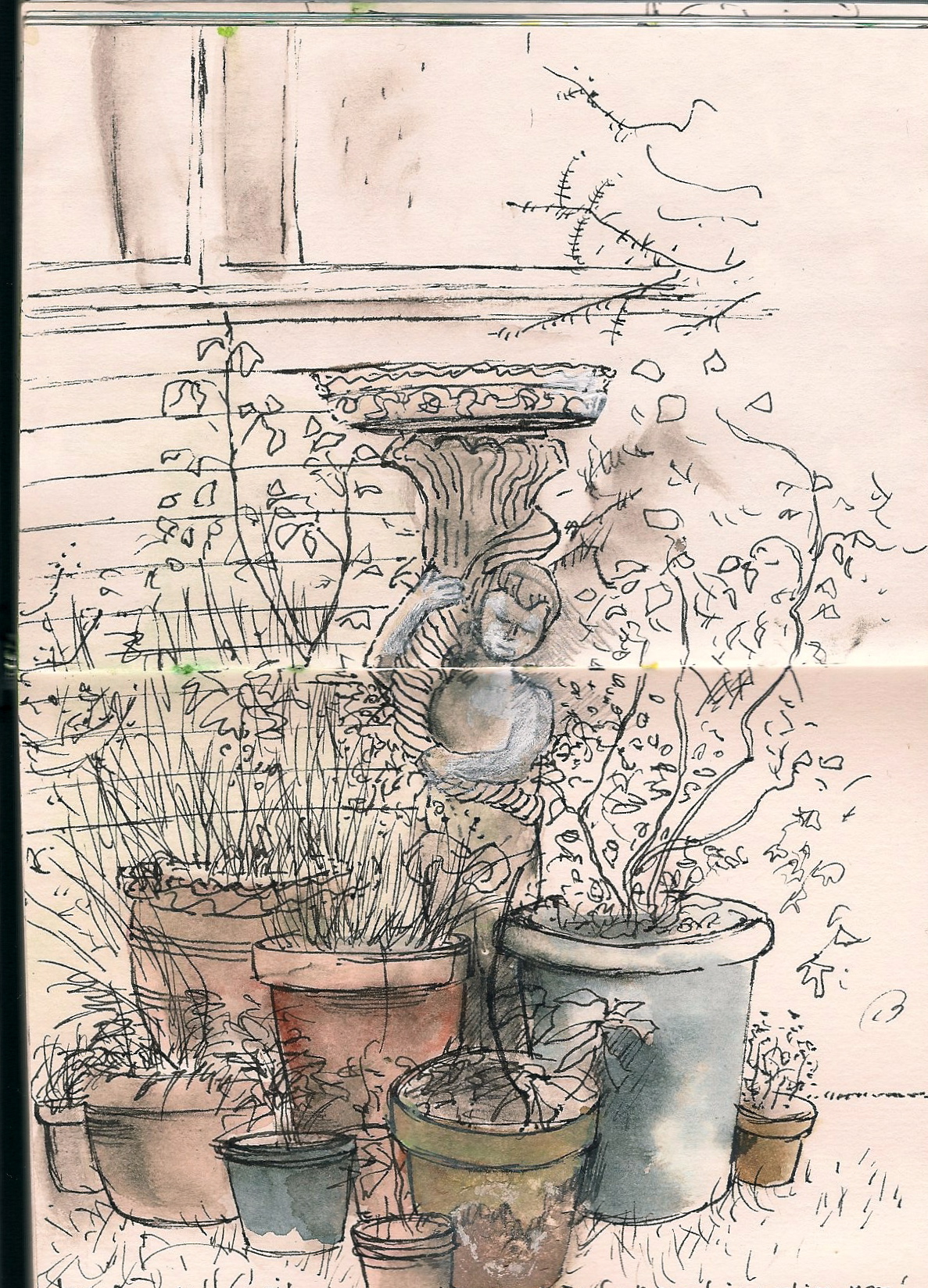 Beautiful sunny day, I am waiting for the Washing machine repair man to come so I can’t stray far from my flat. So for today’s sketch I sit outside and have a go at drawing the birdbath. This solemn looking little chap was rescued from a garden where he had been left by previous owners when they moved and the new owners didn’t want him either. He didn’t have a dish to hold water. I had a dish but no stand, so he found a new home with me in pride of place amongst some pots. He doesn’t seem to look any happier, and I have made it worse by messing around with white paint to try and correct my pen drawing. Twisty stone ornaments are not my strong point as you can see! I like the bluey grey flower pot on the right, although I decided to abandon trying to colour the rest. I have that restless waiting feeling, tinged with a faint sense of anxiety which I feel is reflected in the drawing! The Candy man is not here yet!