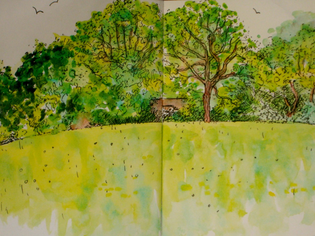 Wow! amazing sunny day with a lovely wind blowing through the trees. I started another sketch this morning at a regular spot, no prizes for guessing, yes, ‘Winnies Hill’. It is interesting to draw the same trees several times at intervals as you really notice the changes as the spring softly turns to summer. I had to leave it to go and do some other stuff, so I went back late this afternoon to finish it. I always feel better as I get the paints out, it is calming and helps to ease away the stress of the day.