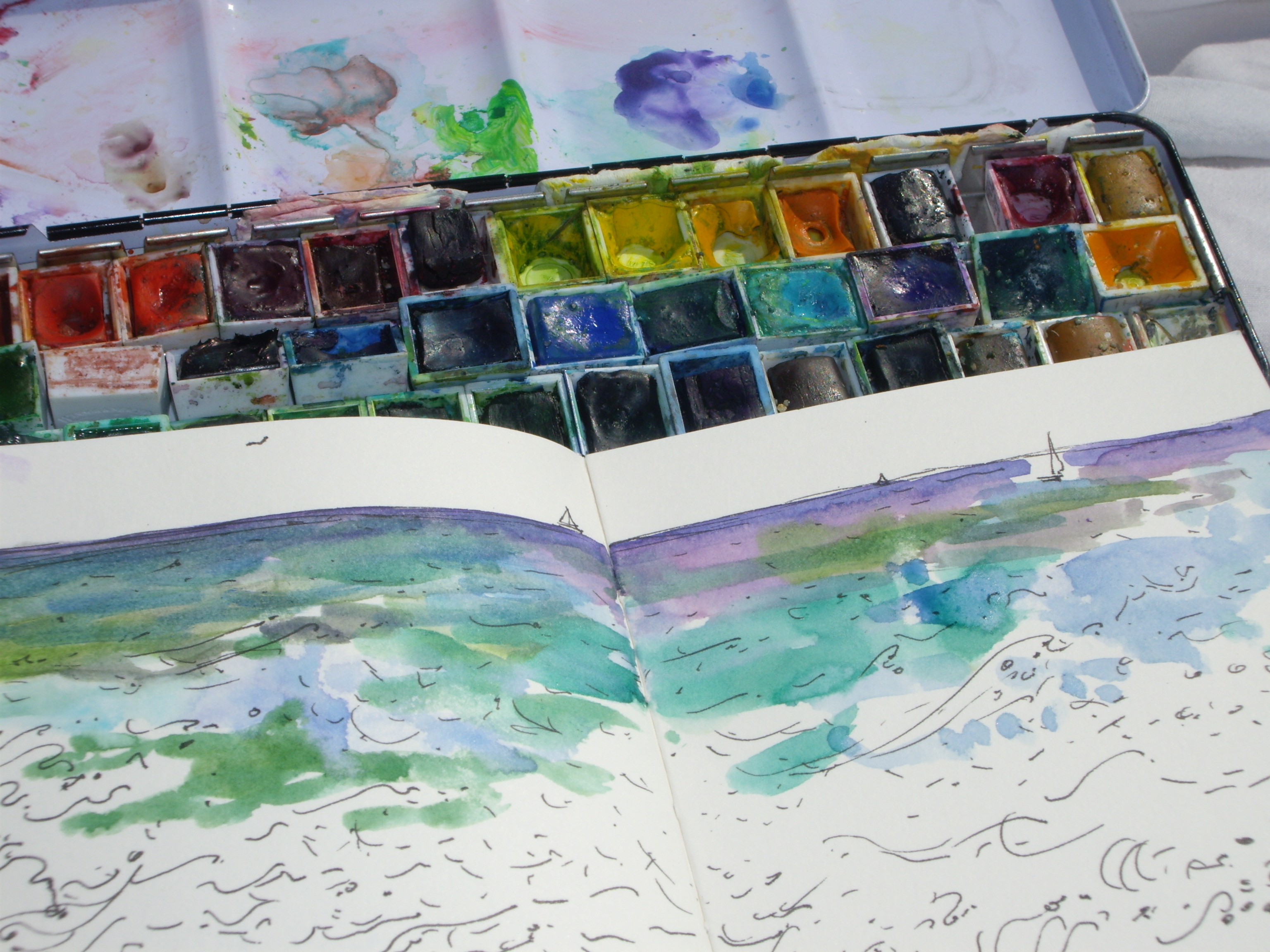 I carried my bike across the pebbles,as close to the water as I could, and went for a quick swim, very cold, but exhilarating! Then I got my paints out and started a sketch.Image
