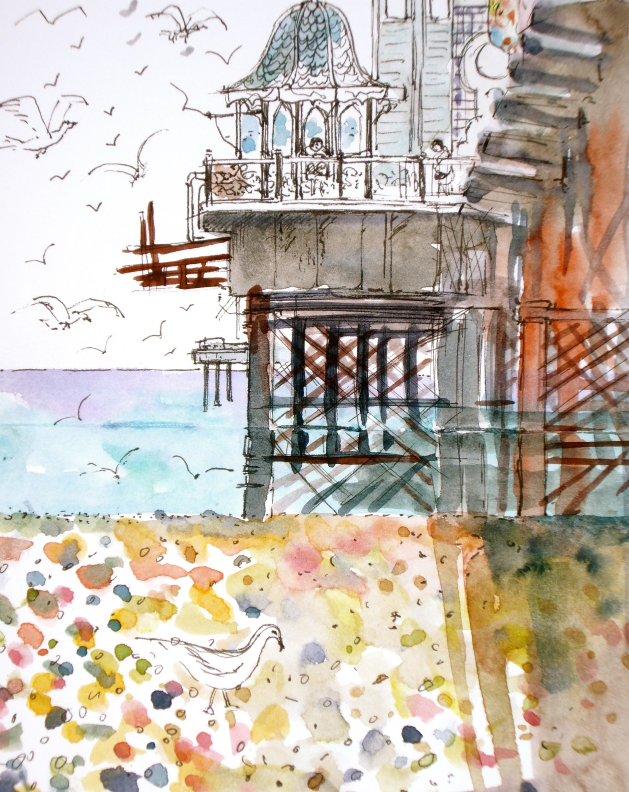 Monday, I cycled from Shoreham to Brighton to meet Michi, she is also doing the 30 day Challenge! We met at the pier and went for a coffee so we could compare our sketches and ideas. Then went down onto the beach where we ended up sitting underneath the pier to find a bit of shade. The structure looked interesting from that strange angle and I thought I would have a go at drawing it, although I admit to being a bit daunted by too many ‘straight lines’. I got tied up in the detail before long and felt like I had bitten off more than I could chew, so I tried to loosen up by adding colour, and soon felt better! Had a bit of trouble with my seagulls, but you get the general idea! [ The one on the beach looks like a cross between a seagull a pigeon and a duck!] Hmm!