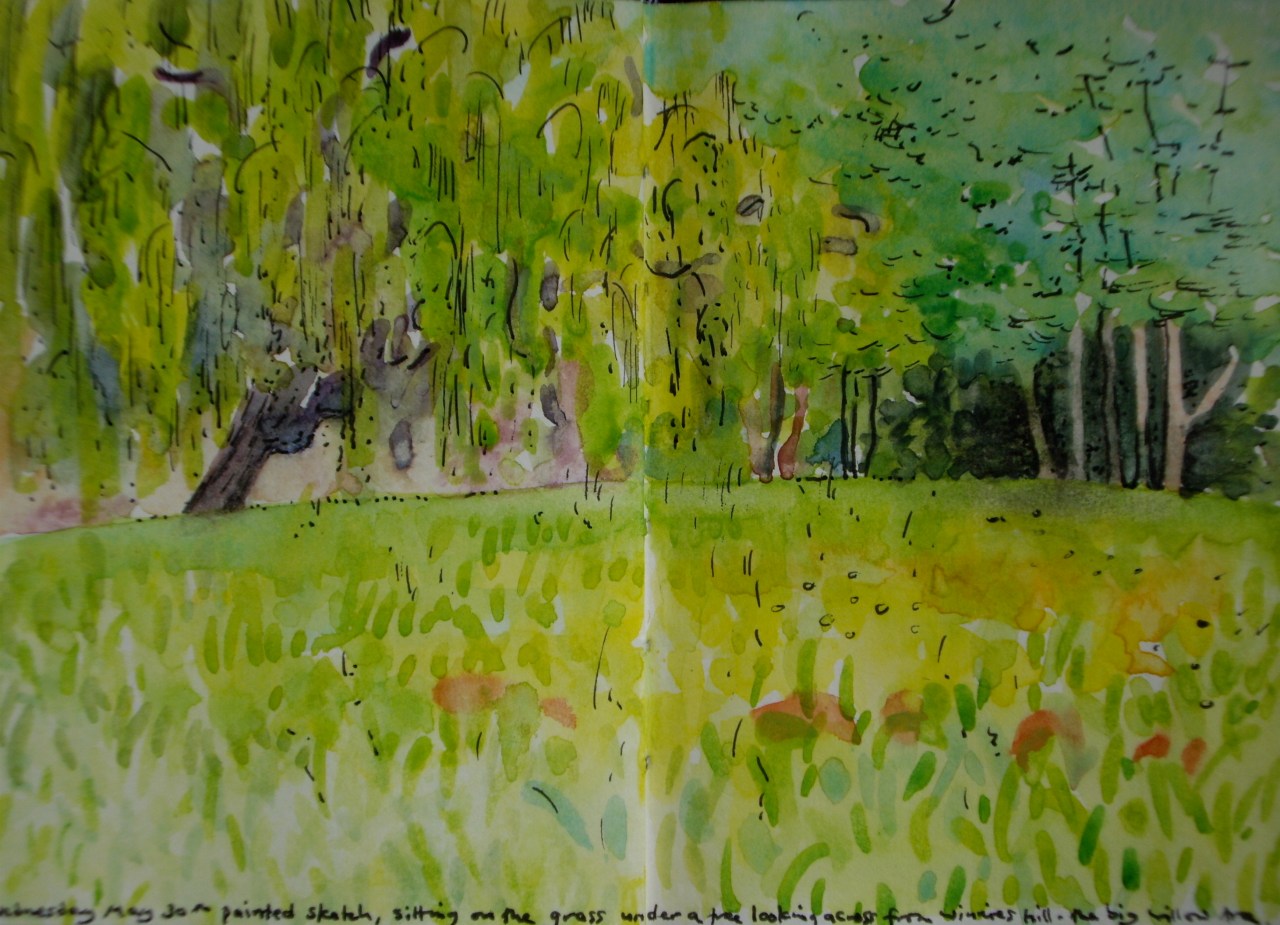 I went to the back of ‘Winnies Hill’, where I started, and sat on the grass under a tree that is almost in the drawing from May 1st, at the top left hand side, just off the page!