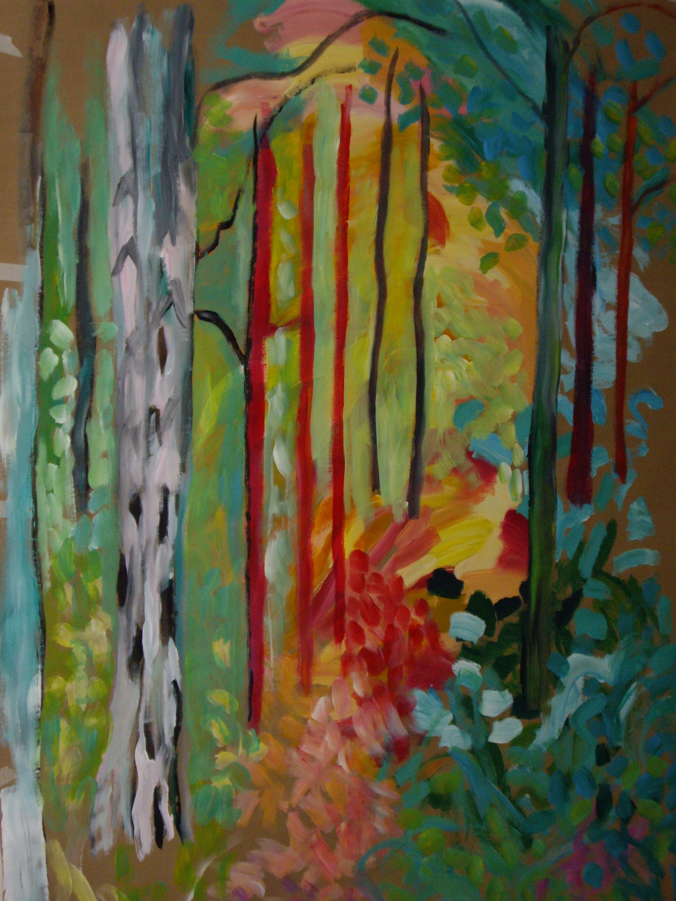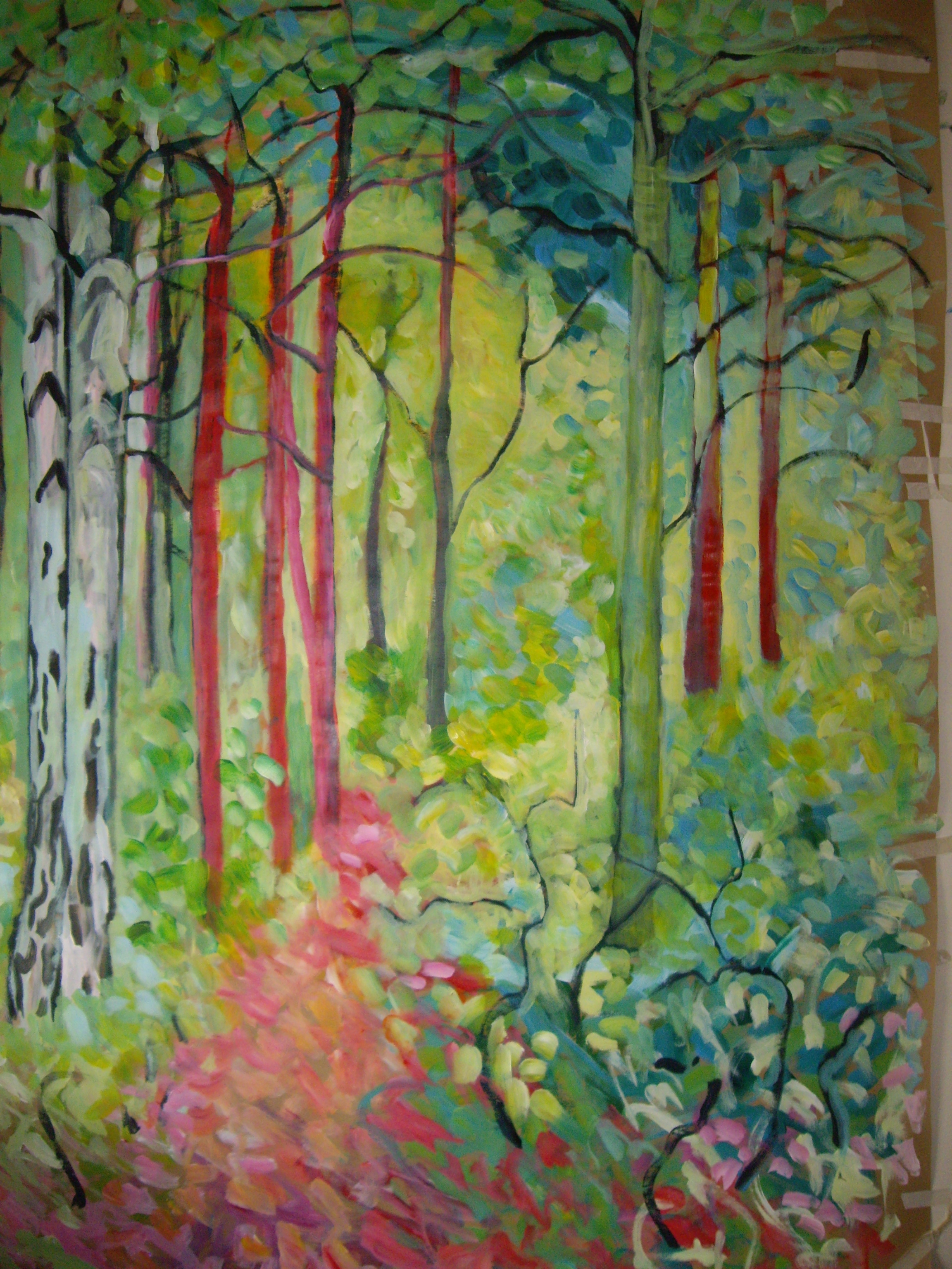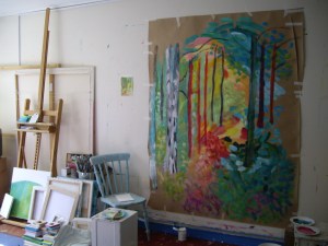 The last couple of days I have been painting on paper, using acrylic paints. The picture is based on a sketch I did in the woods across the road from me, similar to the sketches I posted yesterday. You can see it on the wall to the left of the big painting. The paper is over six feet tall and almost five feet wide. I like working on this scale as I feel like I am in the painting, taking a walk in the woods. These photo’s show a bit of the process.