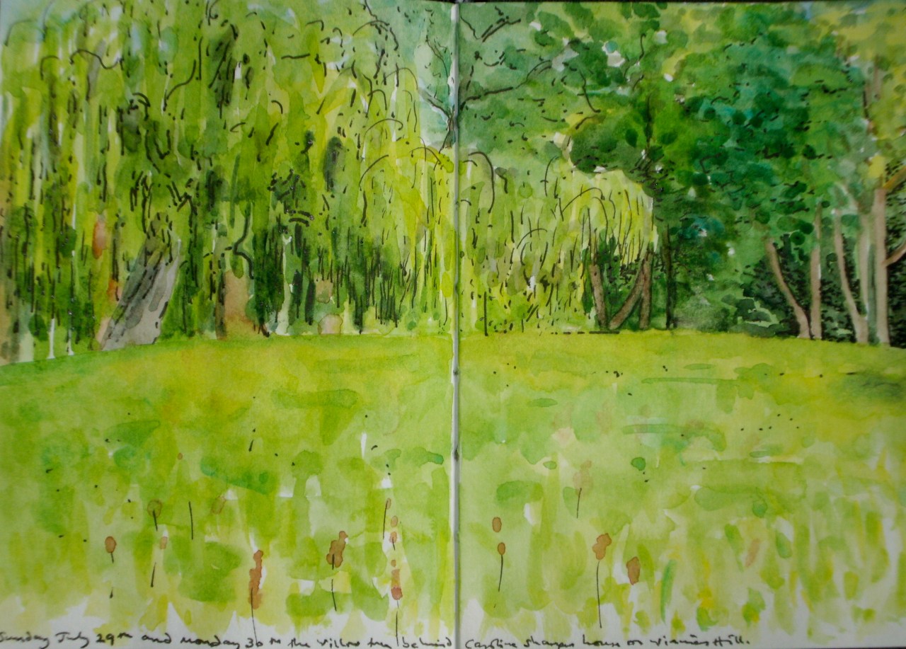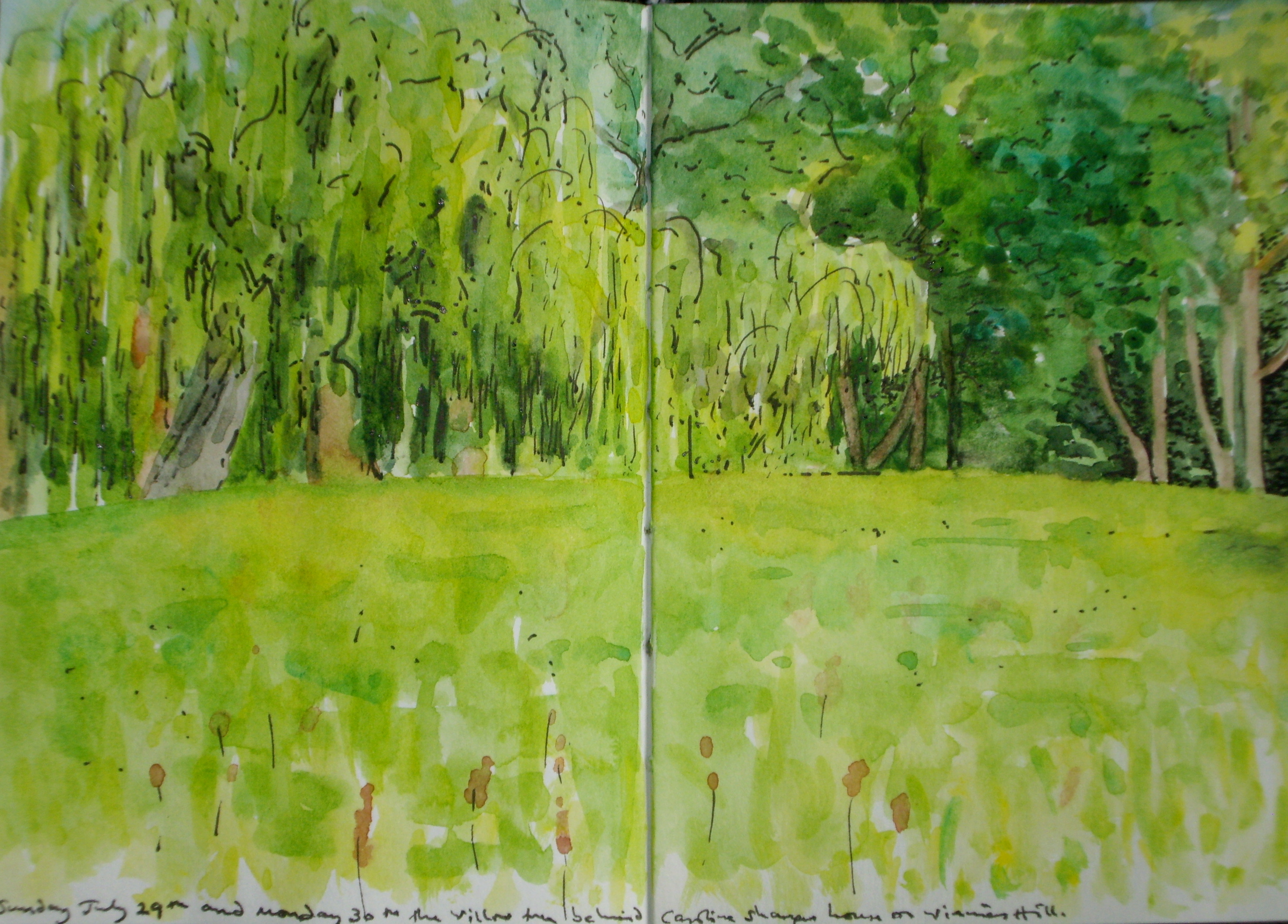 Later, after the rain, I went out again, and painted the willow tree behind Winnies Hill. This morning I went back and drew in the pen lines, two months exactly since I drew it last time. The leaves are down to the ground now.