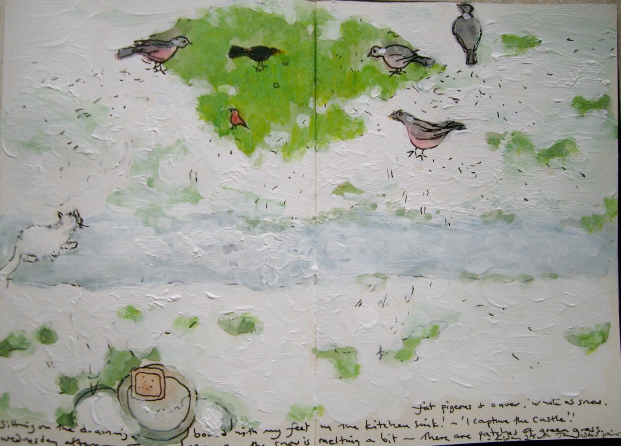 I have arranged myself sitting on the draining board with my feet in the sink! I remember this position described in the book ‘I Capture the Castle’, that I read many years ago, and recently watched again on a DVD I found in a charity shop. I am trying to draw the view looking down from my first floor kitchen window. It is an odd angle, but I can just see the top of the birdbath, and the snow covered pots around the base.