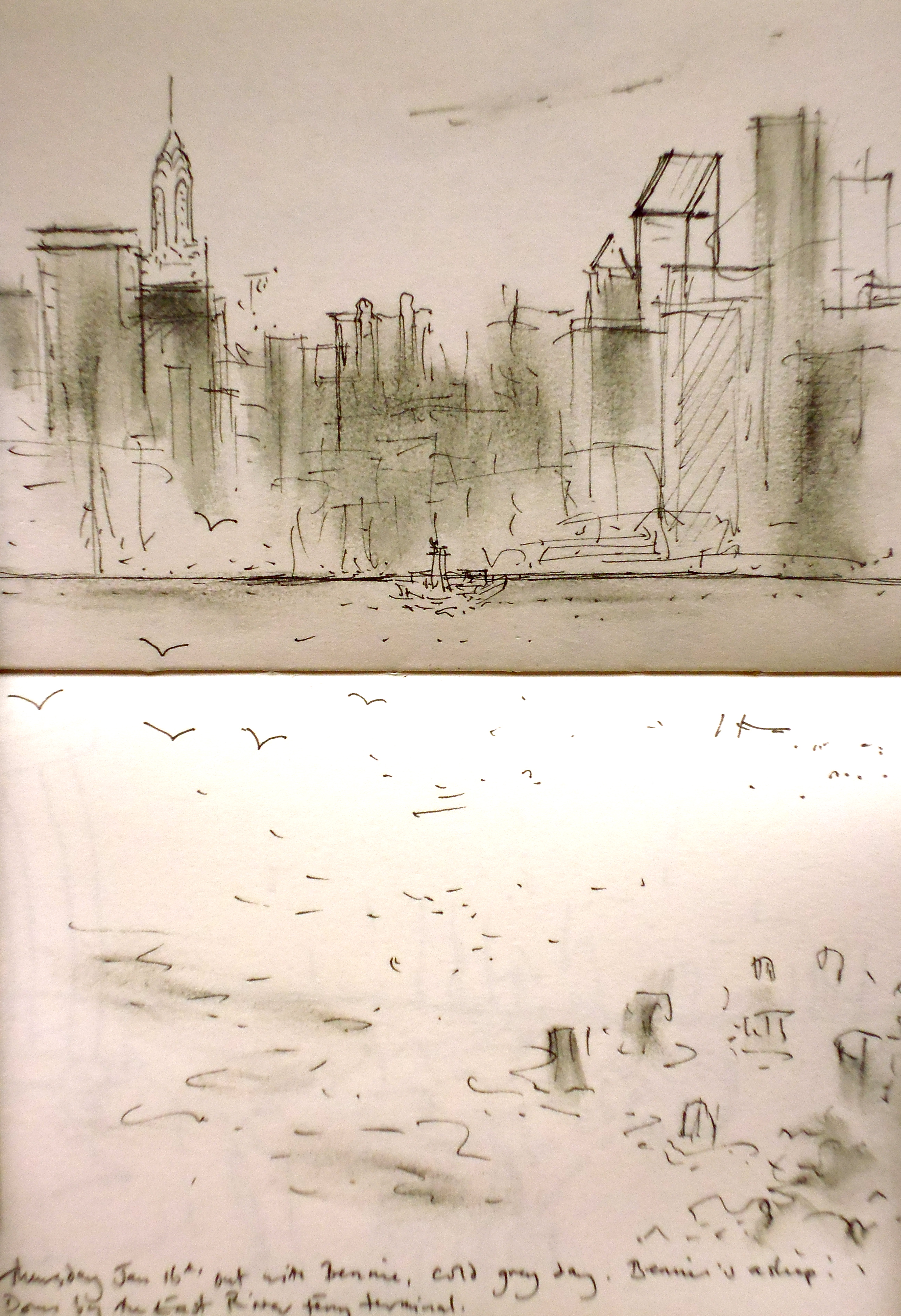 Grand Ferry Park was where the ferry used to leave Williamsburg many years ago. Nowadays it leaves from a little way further up the river. This is another very quick pen sketch, looking out across the East River to the Manhattan skyline. January 2014, freezing cold! A few days later the river was frozen!