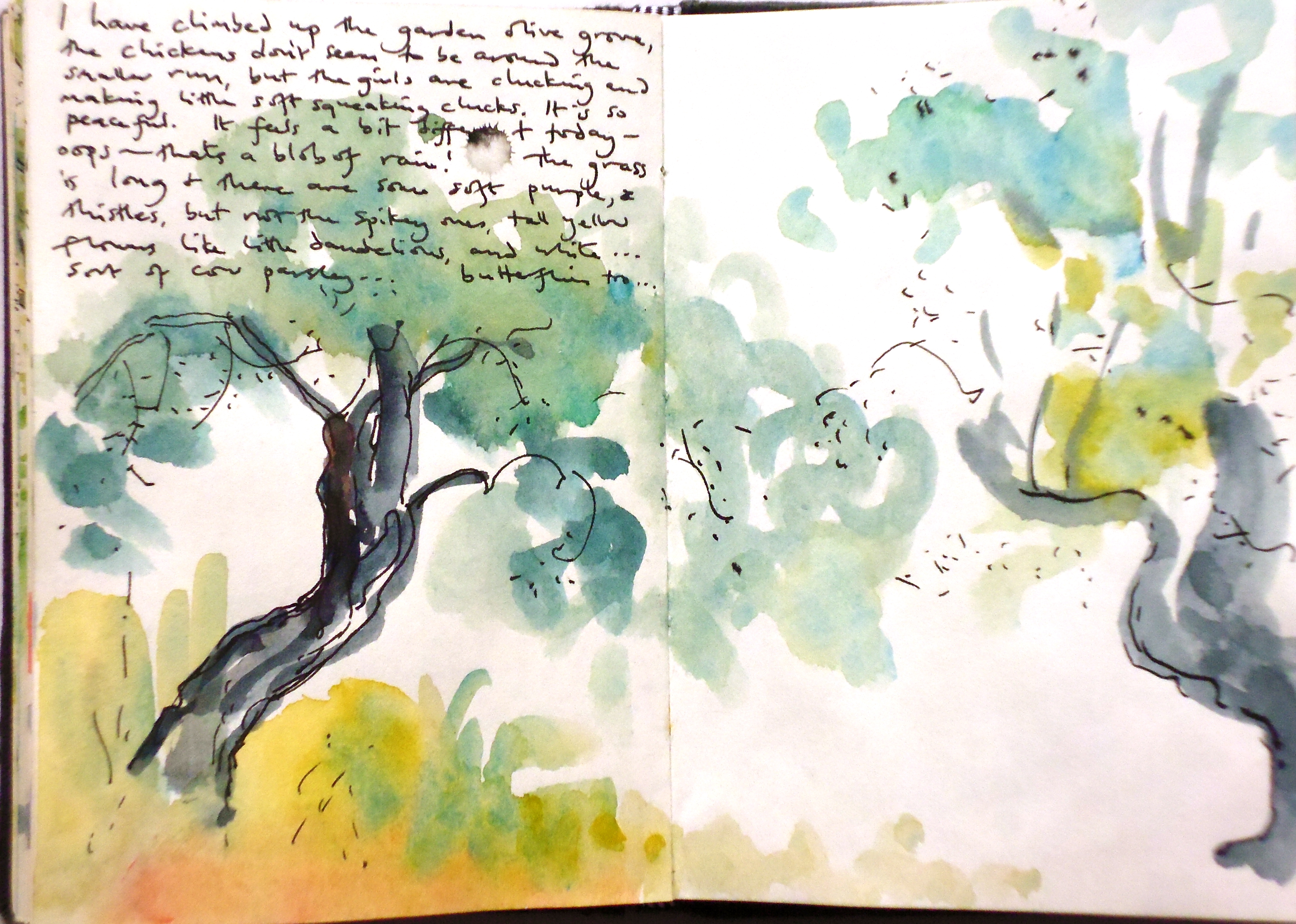 I recognise the old olive trees I sketched before. One with a bendy branch that twists and turns, and tapers into a thin wispy line, it is still here, exactly the same, the fragile squiggle of branch still holding a few leaves, exactly the same, not snapped off or cut down or touched in any way it seems. It is poignant and wonderful to think of it standing there all this time, while we rush about with our lives busy going from this place to that, and all that has happened since I last saw these olive trees. They are still here, old and wise, shimmering grey green silent and peaceful.