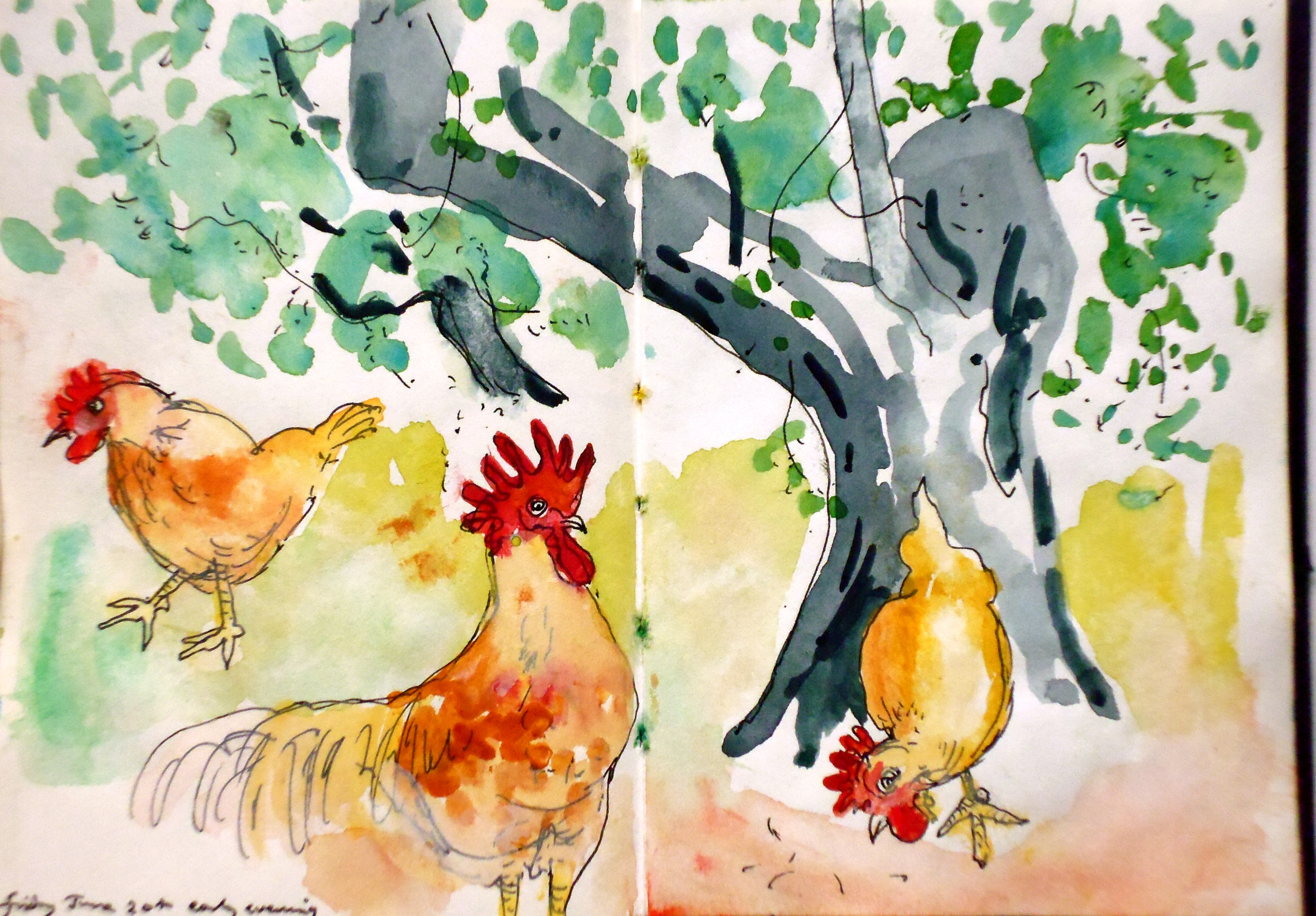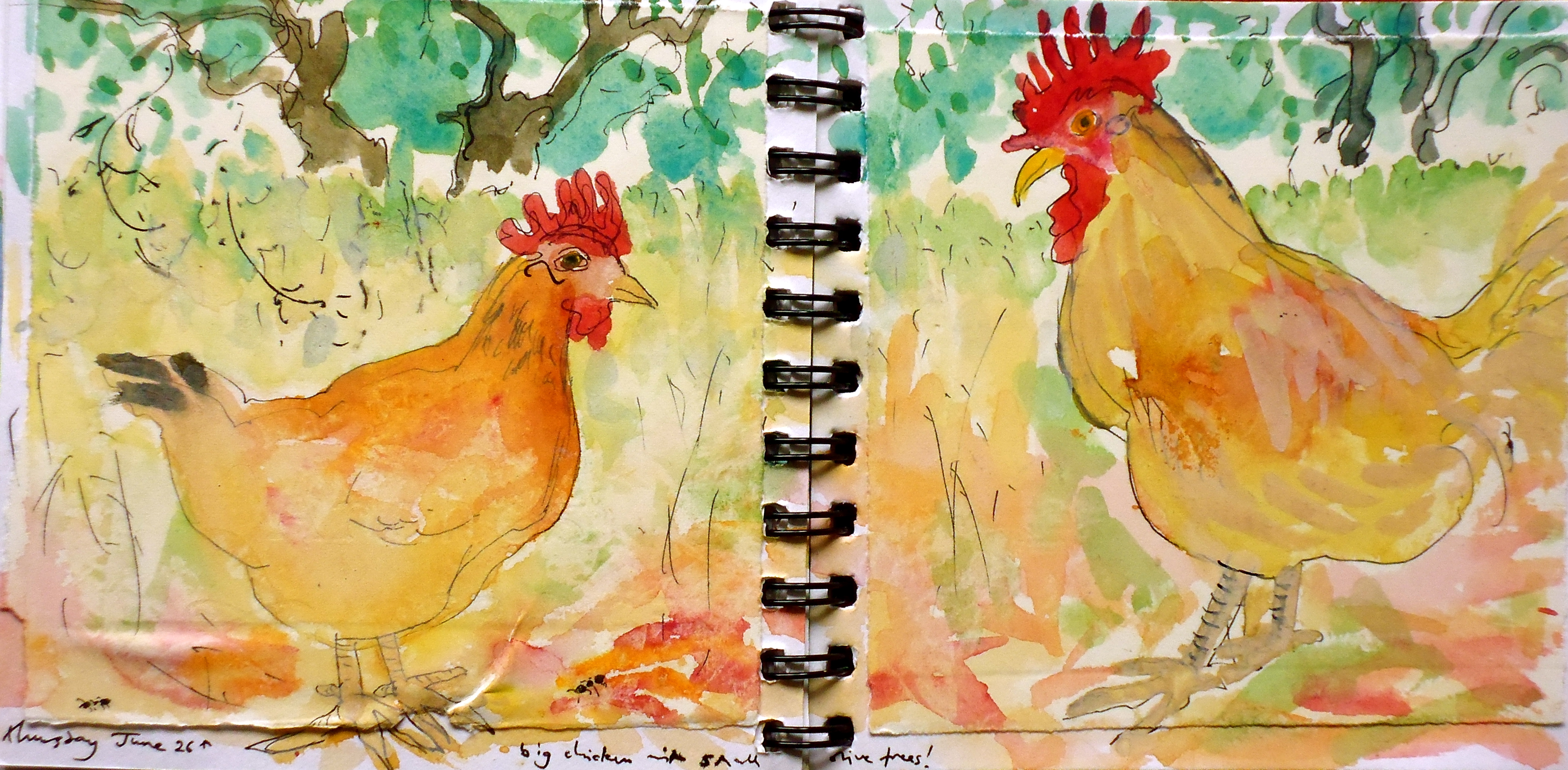 She said, how about some BIG chickens and really small olive trees! I explained that I was having trouble with the chickens as they keep on walking away,trees usually being much easier to draw as they stand still! Although there was one hen that seemed very curious and she came up to me closer and closer until she was almost in my lap! We eyed each other suspiciously, her beak seemed very big and sharp close too, but she didn’t peck me, just looked at my drawing intently. I don’t think she was impressed!