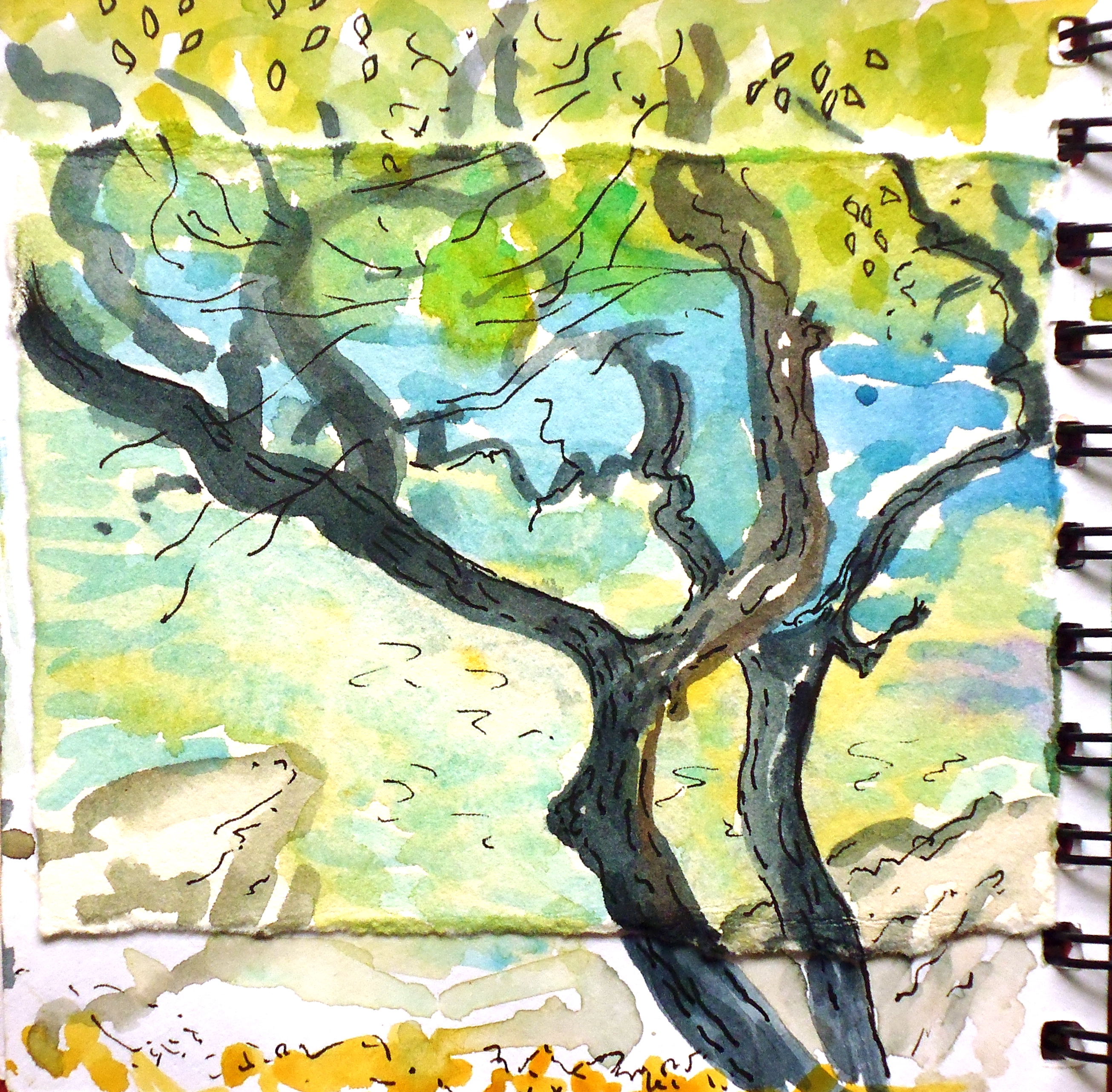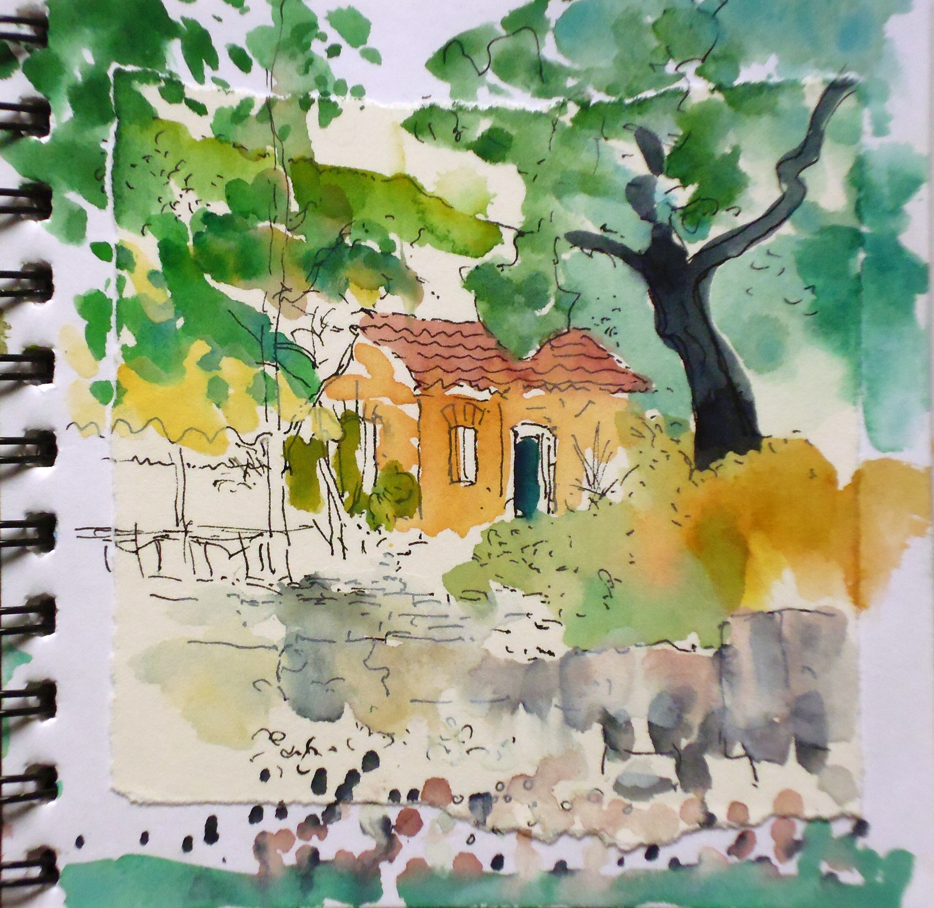 I walked up into the olive grove, and sat down to sketch looking down over the beach. Such a beautiful peaceful place. It is impossible to do justice to the sparkling water shimmering like jewels, the dark trunks of the old gnarled olive trees with their soft grey green little leaves, the pinky sandy path scattered with small stones. But I must try! I have stuck little pieces of watercolour paper onto some of the blank pages of this sketchbook as I don’t really like the very bright white cartridge paper. You can see the edges!