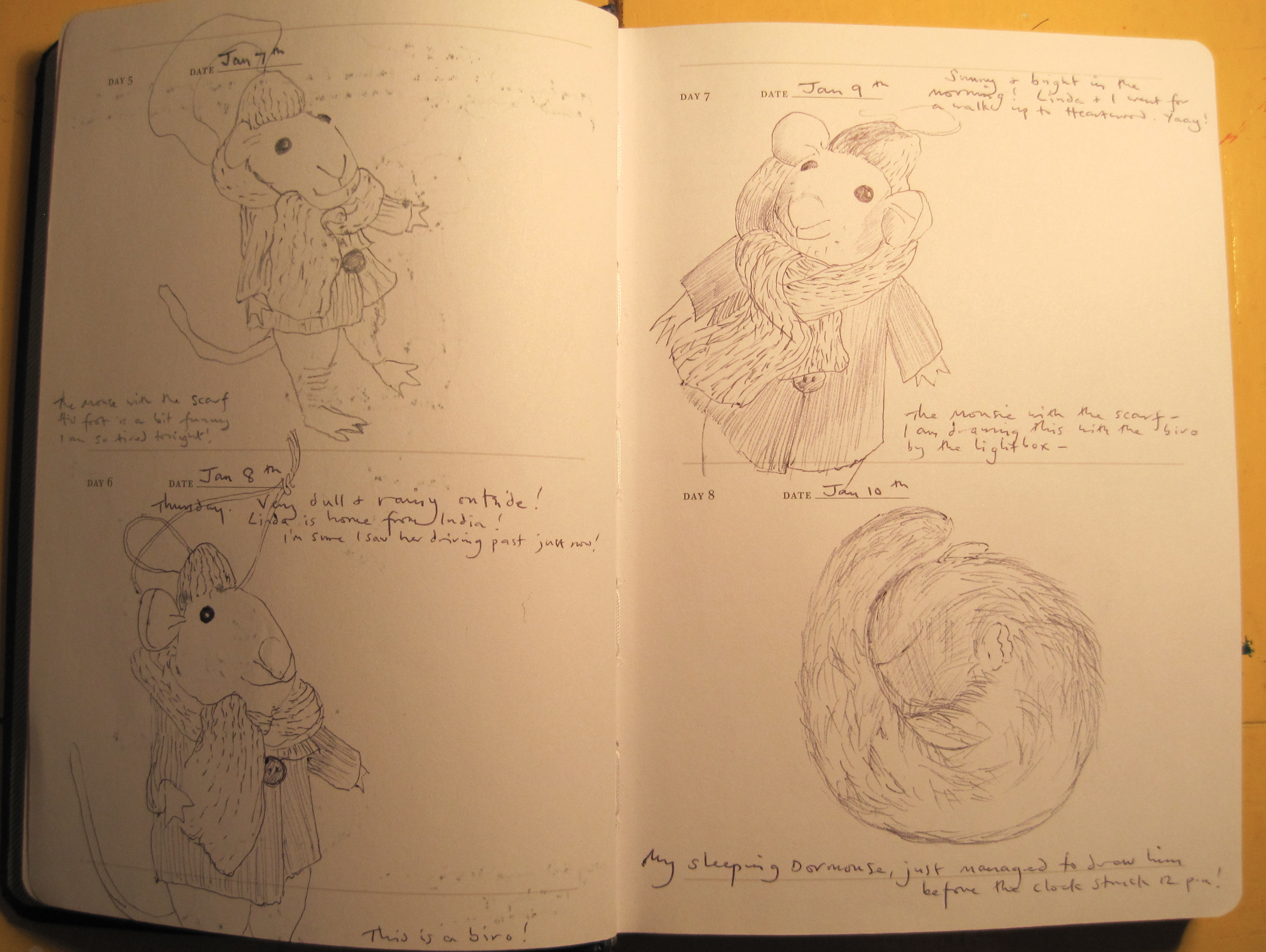 I always find it a bit difficult to get going again with my artwork in January. But when I arrived back home from being with my mum over christmas and new year there was a most wonderful surprise waiting for me on the door mat. My lovely niece in Brooklyn had gone to the trouble of finding and posting me a gift which was just what I needed to spur me on. A sketchbook journal, hopefully entitled ‘ONE SKETCH A DAY’. Inside it read ‘A yearlong record of sketches- because every daily drawing is worthy of remembrance.’ Further down the page it says ‘ HOW TO USE THIS BOOK’ with instructions on filling in the dates for today and tomorrow. Then it says ‘Now sharpen your pencil or take out your pen…’ Well after reading that I felt compelled to obey! Along with the book were some gorgeous christmas tree ornaments, little mice with hats and coats on, one with a thick scarf around his neck. Also a little rabbit with strange long ears, like wings! I hadn’t yet packed away my christmas tree so I hung them up, then took out a pen and wrote Jan 3rd in the allotted space in the book and drew a tiny sketch. So far this month I have managed to draw a little sketch everyday since even if it is the the last thing I do!
