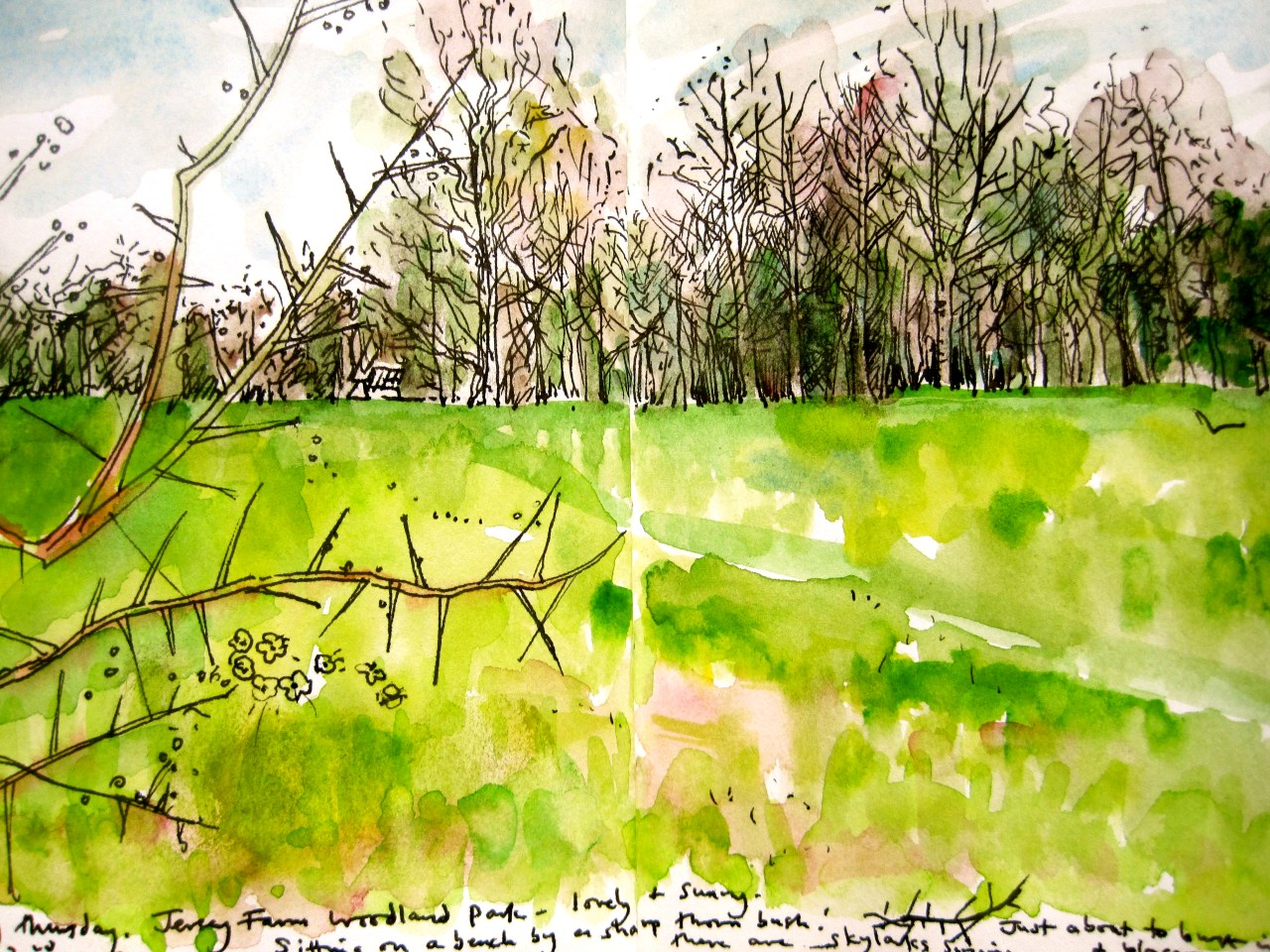 I have made a few attempts to sketch outdoors during march! Not very successfully really with the cold wind and occasional hail stones making me pack up sooner than I would have liked! But today was beautiful and sunny and I went across to Jersey Farm Woodland park and sat on a bench.