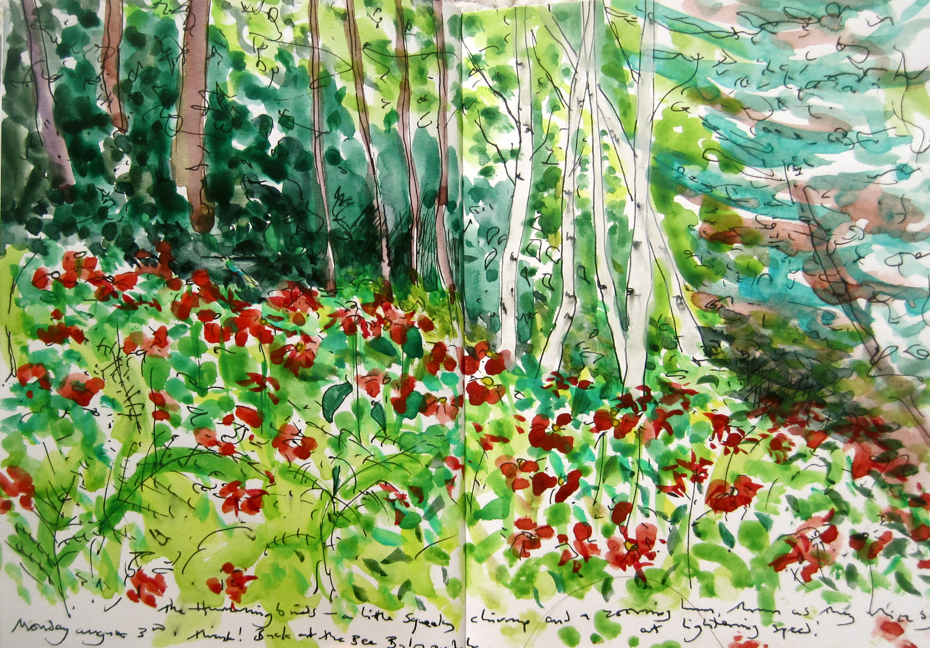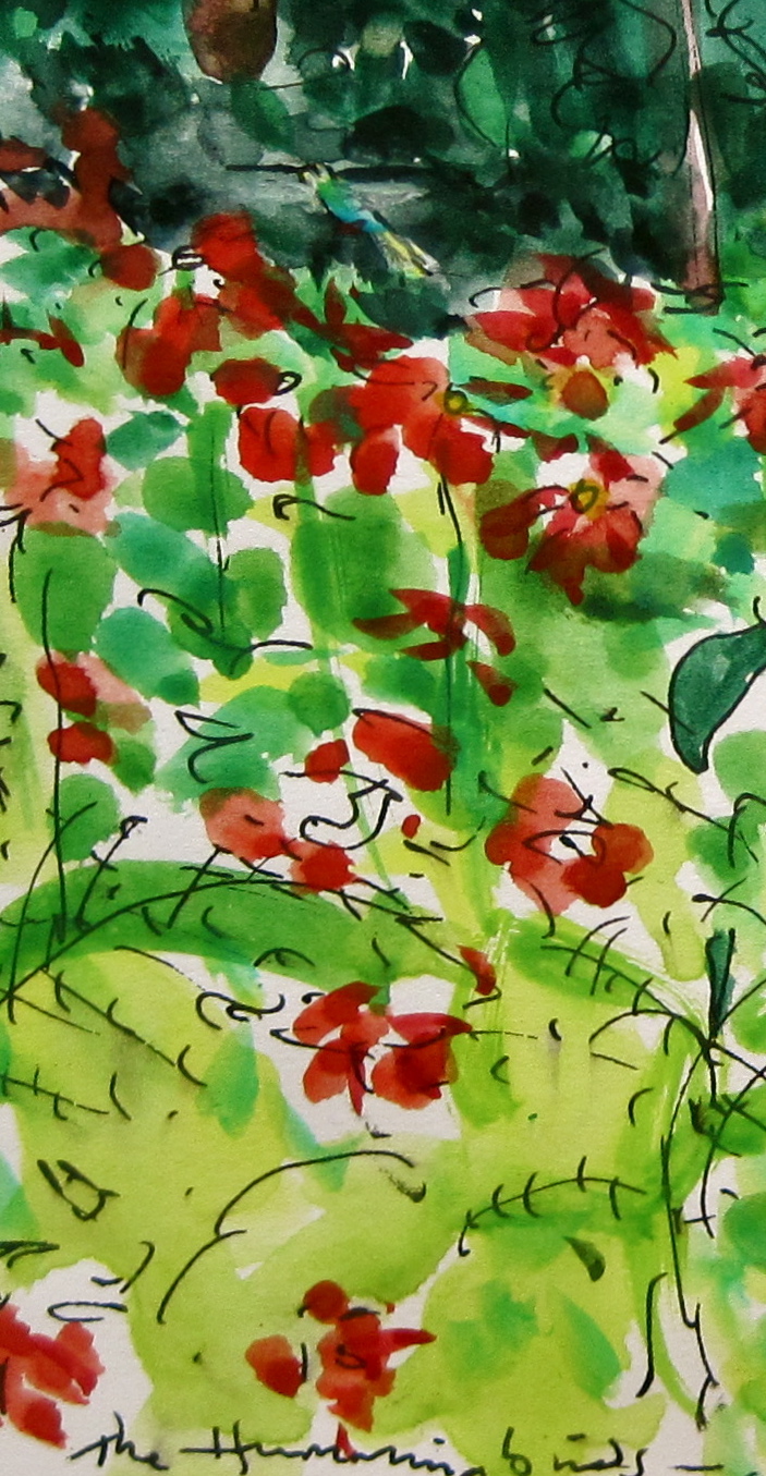 At the house in Vermont, down by the edge of the woods, near the little lake is a patch of Bee Balm flowers. Tall flowers with dark pink glorious blooms, intermingled with wild raspberries. It is so quiet in this magical place. Listen! There is a vibration in the air and tiny green and blue creatures darting about and hovering in the air. Are they fairies? They could be! They are the most enchanting things I have ever seen. Humming birds!