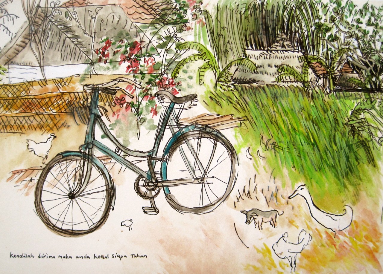 This picture is a drawing I made in Bali, Indonesia, where I hired a bike. The left side of the drawing is what was in front me and the right side of the picture is what was behind me. I am not sure where the little pig was as he is certainly not to scale!