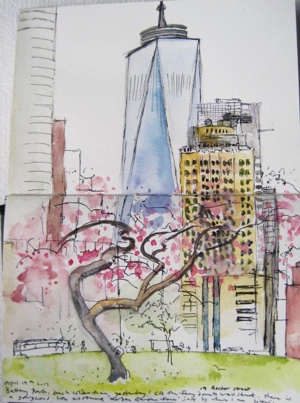 I have been in Brooklyn NY recently to see my great nephew and meet his new baby brother, just born! The spring blossom was starting to come out, a little bit later than ours, bright green leaves slowly unfurling on the trees. We were busy with the baby but I managed a few little sketches. The first one a quick pen drawing of a view from Fort Greene Park, across to Manhattan, with a glimpse of the new Freedom Tower on the left. I hadn’t got my bearings quite right and wrote at the bottom of the page, ‘Freedom Tower NY and Williamsburg Bridge, I think,’ but my mistake, it is the Manhattan Bridge!