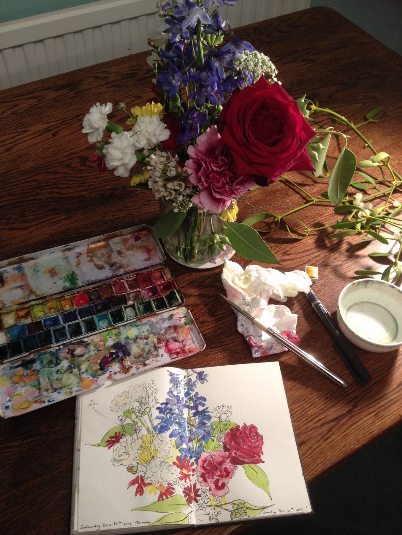 It’s 10 pm on New Years Eve. I am sitting in the dining room at my mums. I have been doing a couple of sketches yesterday and today, of a little jar of flowers that remind me of summer! But if you look a bit closer on the table you will see a sprig of mistletoe! Happy New Year everyone!